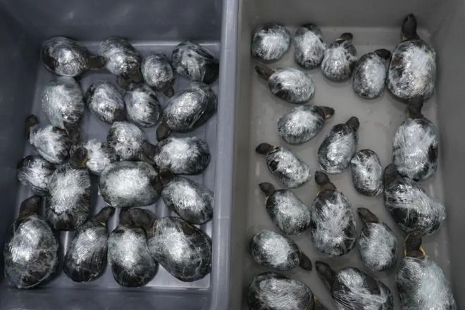 更令人意外的是,五分钟后,另一位穿着打扮几乎复刻的女子出现在查验通道。同样的黑色纱裙,同样僵硬的步态,甚至连紧张时抠手指的小动作都如出一辙。有了前车之鉴,工作人员立即将其拦下检查,果然在她的紧身裤内发现了29只同样的乌龟,捆绑手法与前一位女子完全一致。短短十分钟内,海关就截获了68只非法入境的活体乌龟。